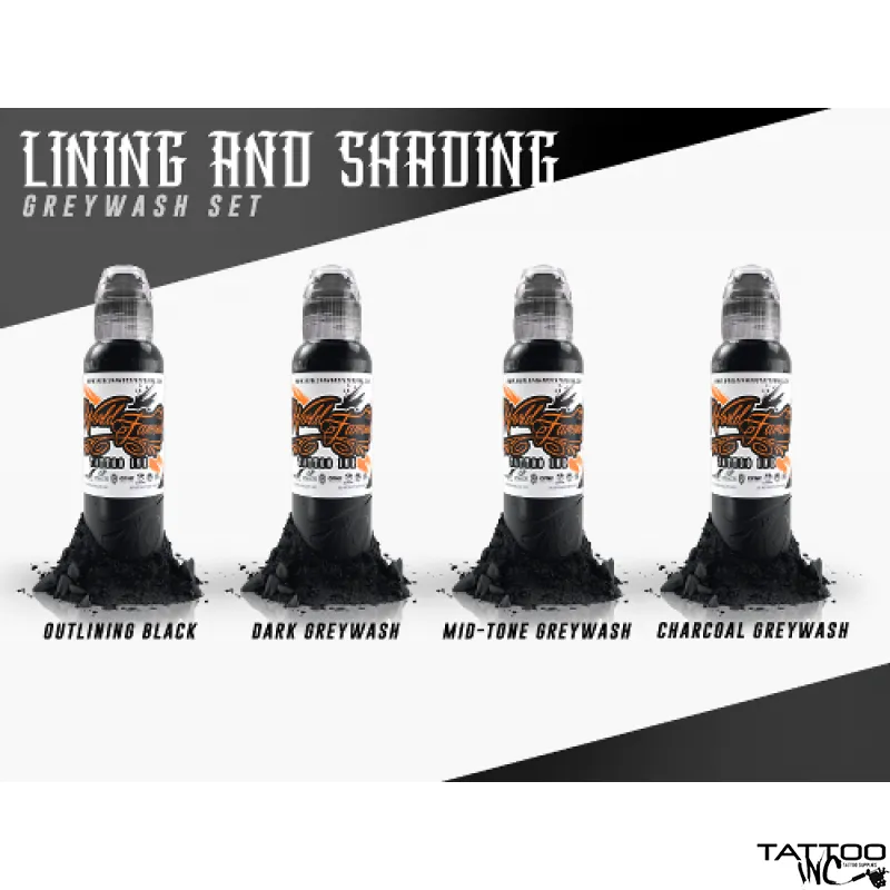 Offering high quality inks to some of the most renowned tattoo artists for over 50 years, World Famous Ink presents this superb set of lining and shading inks. The set is comprised of four 1 oz. bottles of ink, including Outlining Black, Dark Greywash, Mid-Tone Greywash, and Charcoal Greywash. Each crystal-flex ink bottle comes equipped with a permanently adhered label, a twistable cap for convenient pouring, and a clutch cap complete with a safety seal between the bottle and the inner flow tube. This reliable set of standard ink comes in a plastic box complete with a flashy insert boasting the World Famous Tattoo Ink brand name.